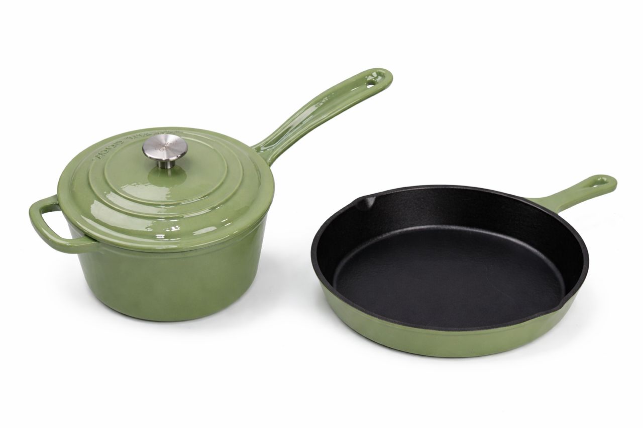 Bring efficiency and style into your kitchen with the Elite Green Cast Iron Essentials Set (2-Piece). This carefully selected combination of a sauce pan and frying pan is perfect for everyday cooking whether you’re preparing quick breakfasts, simmering sauces, or frying your favorite meals.