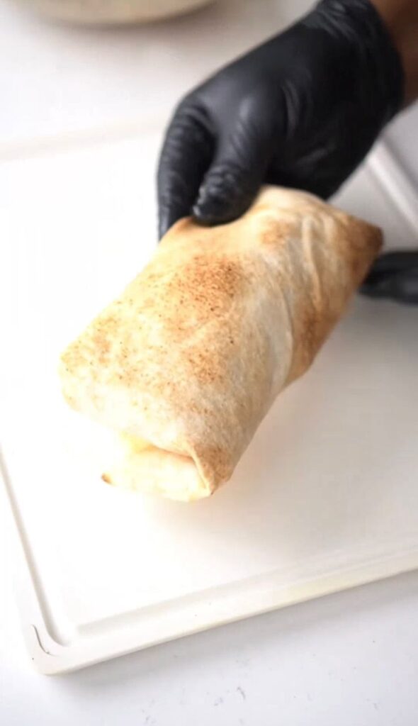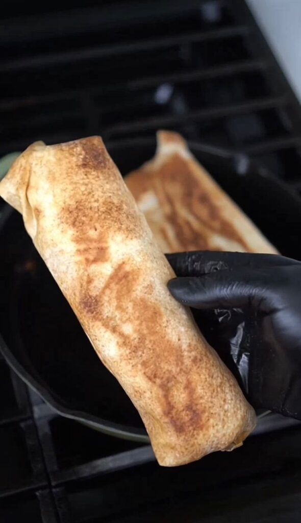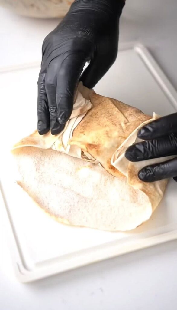 Roll the shawarma tightly and press the ends. Toasting in a pan helps seal it and prevent leaks.