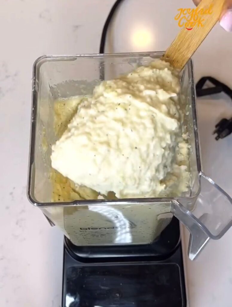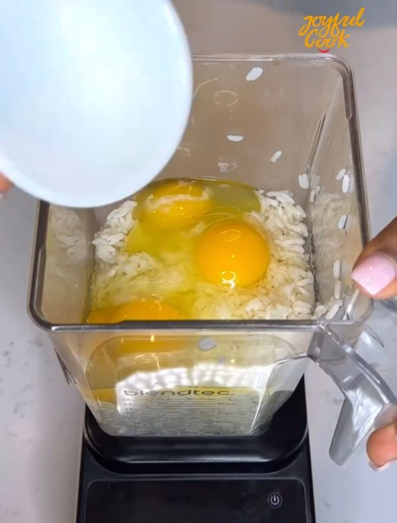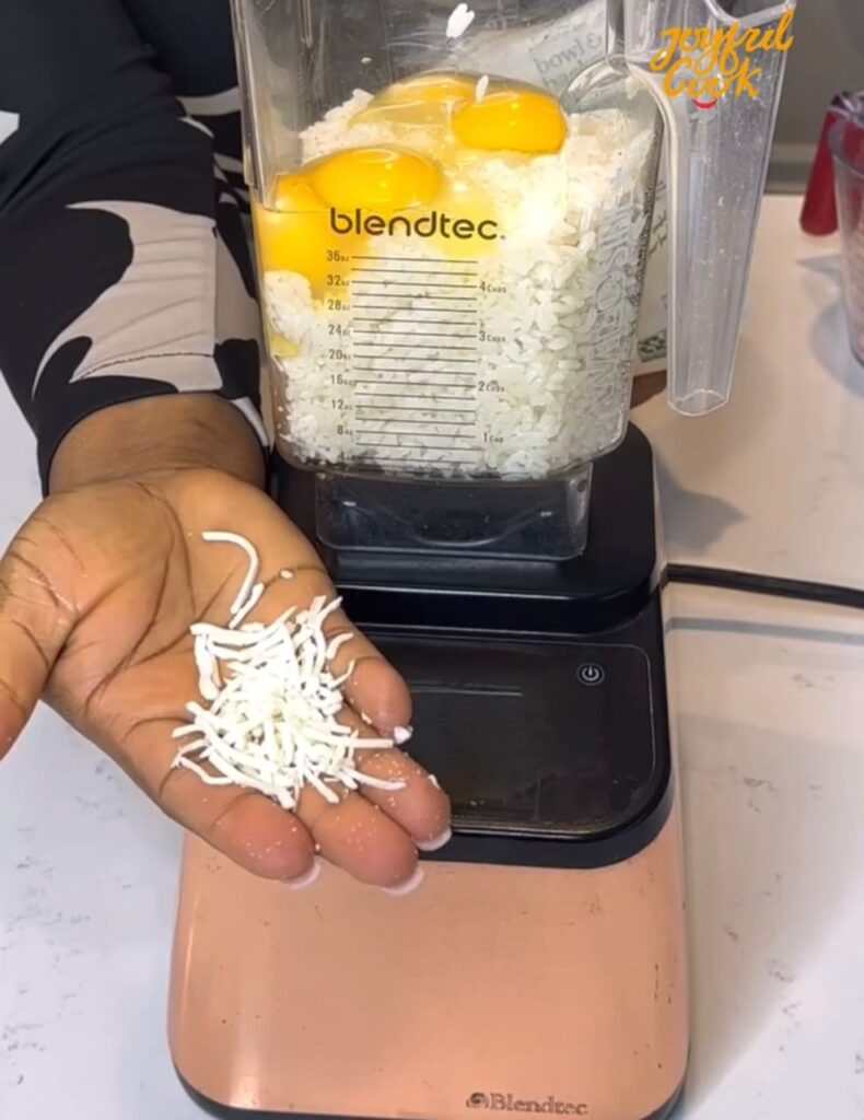 Crack in the eggs, add mozzarella cheese, black pepper, and a splash of water. If your rice was cooked with salt, you can skip adding more. Blend everything until smooth and creamy.