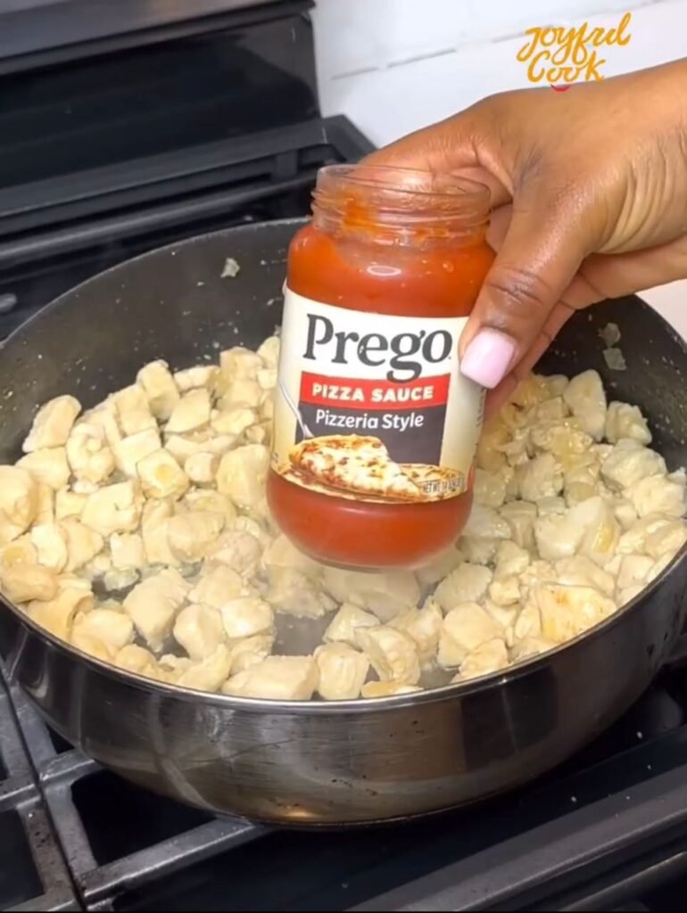 Add your pizza sauce, stir well, and let it simmer for about 3 minutes. Once everything is well combined and flavorful, take it off the heat.